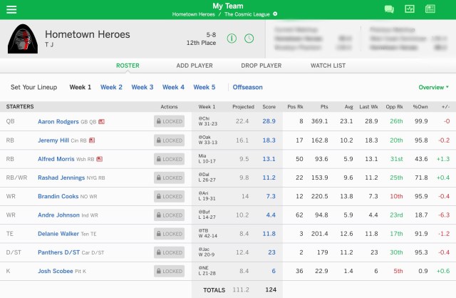 I finished with a record of 5-8, along with 2 other teams, 4 teams finished 6-7, 3 went 7-6, 1 went 8-5, and the best record was 10-3. This was the most competitive league I’ve had to date. It was fun, I just didn’t do well. The eventual champion barely made the playoffs with a 6-7 record (Congrats Al) , so in hindsight I didn’t do all THAT bad. Next year I’ll get back on track, back to my winning ways, I know it.